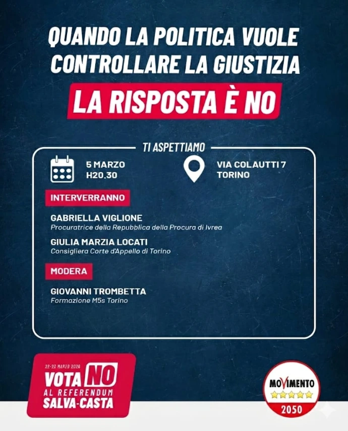 Il 5 marzo alle ore 20.30 ci incontriamo a Torino, in via Colautti 7, per un momento di approfondimento pubblico sulla riforma costituzionale della giustizia e sulle sue conseguenze per l’equilibrio dei poteri nel nostro Paese.